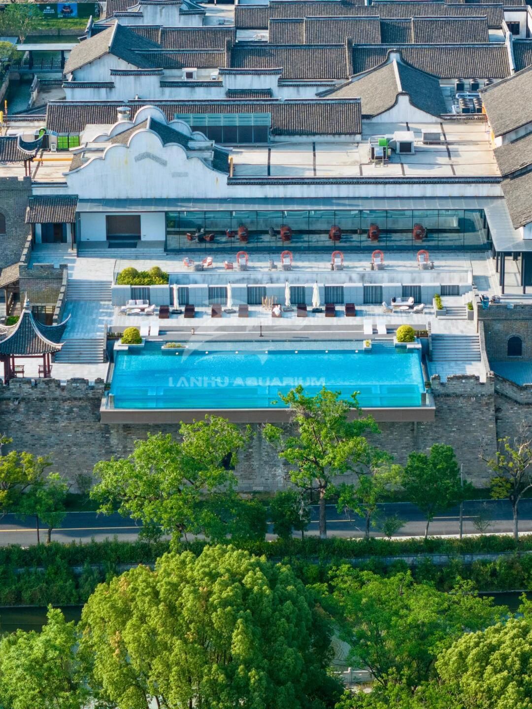 波光粼粼無邊透明泳池坐落在安靜的古城建筑中,更顯一股靜雅之感。