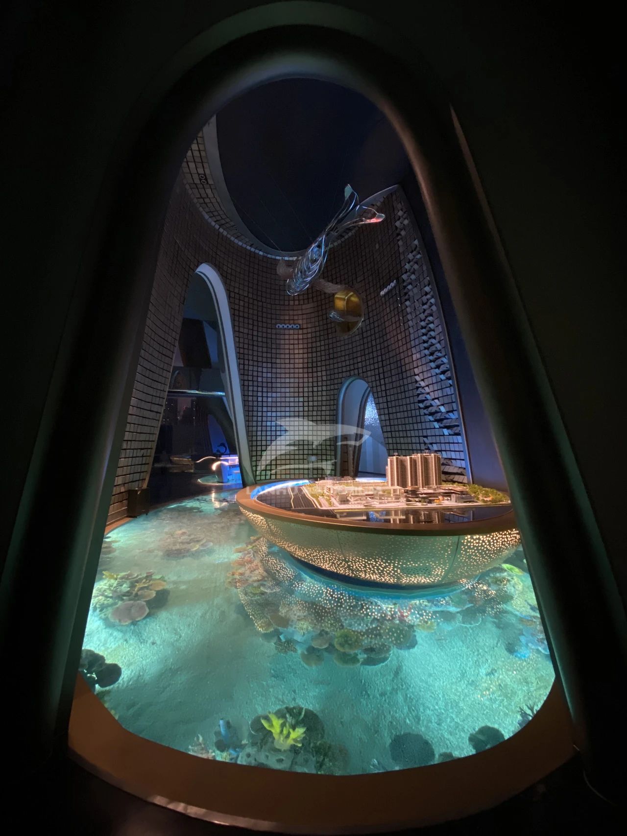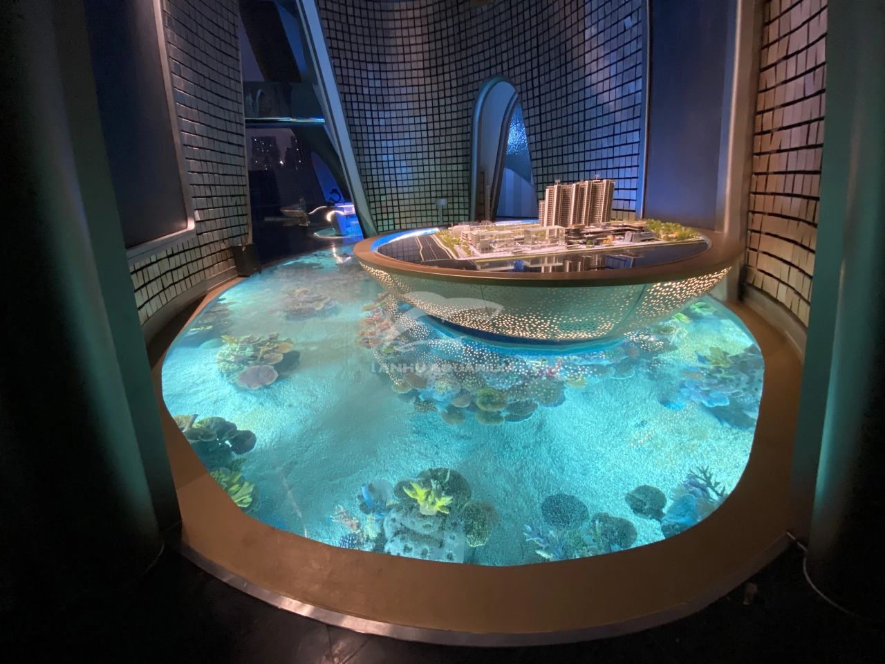 項目采用海洋度假生活方式的理念進行打造,整個售樓部猶如一個海洋館。透過亞克力材質(zhì)地板欣賞到華麗多彩的海底奇境。十余種海洋魚類在水下珊瑚造景中游來游去,隨手一拍都是海洋館的既視感,讓整個室內(nèi)仿佛圍繞一個巨大的水族箱,創(chuàng)造出前所未有的奇觀式體驗,