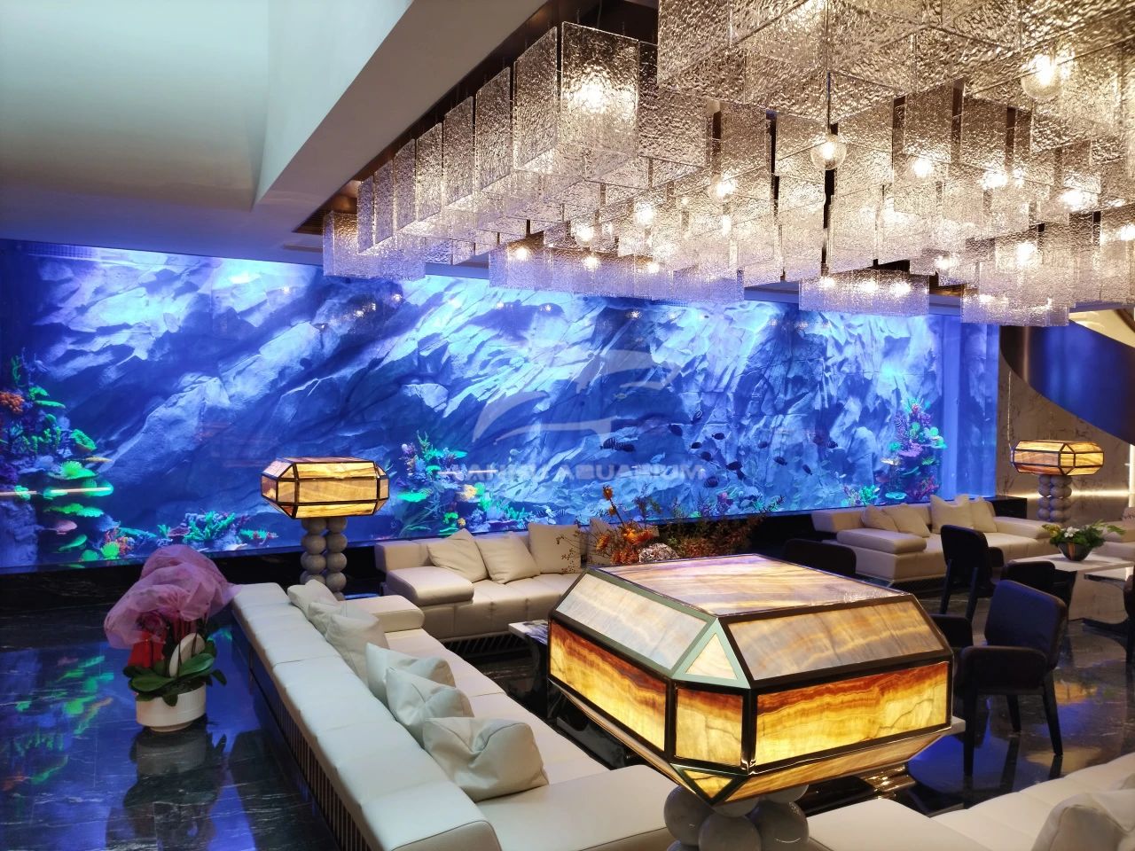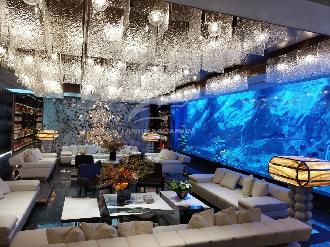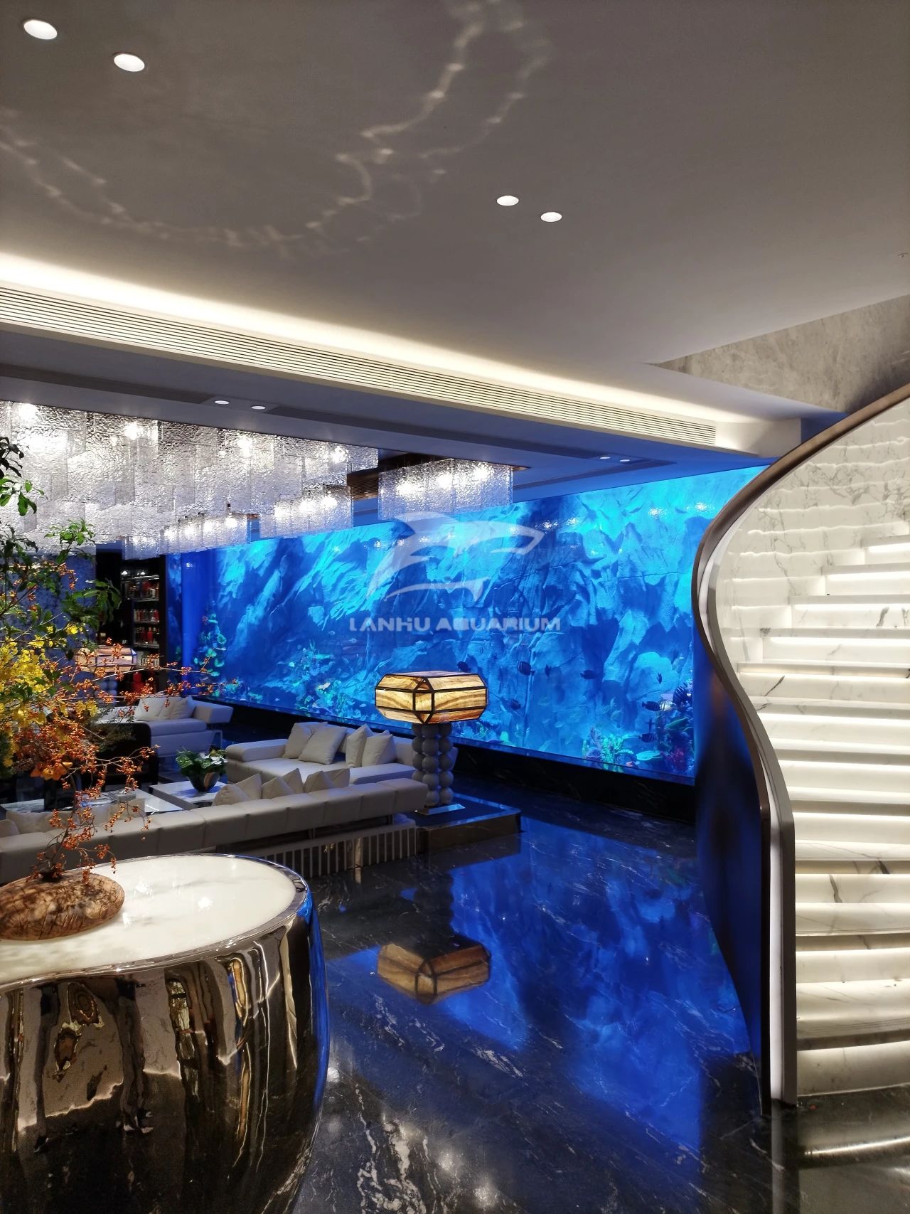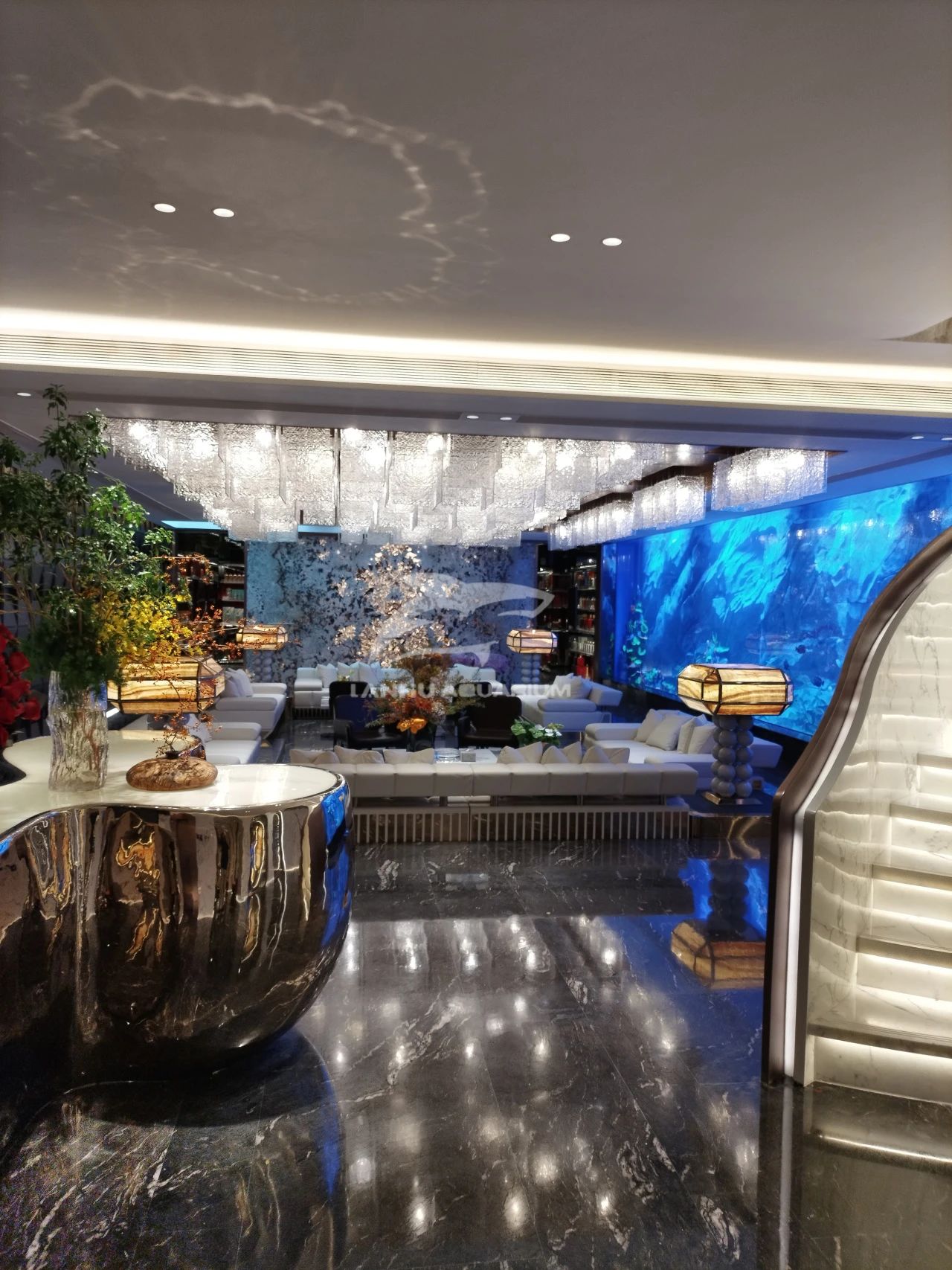 上海藍(lán)湖水族工程有限公司遵循藝術(shù)品為前廳點綴雅奢品味,海洋流動形態(tài)的魚缸以自然語序筑造藝術(shù),在奢石與金屬線條構(gòu)成的空間中,置入15米長亞克力玻璃組成的海缸裝置, 空間流動、浸潤之感油然而出,讓觀者行進(jìn)的腳步漸緩,“慢享”一處悠然。