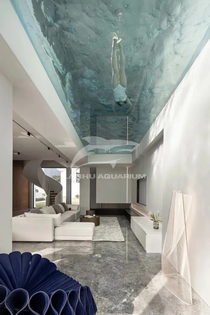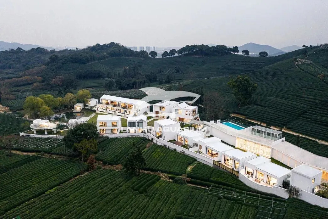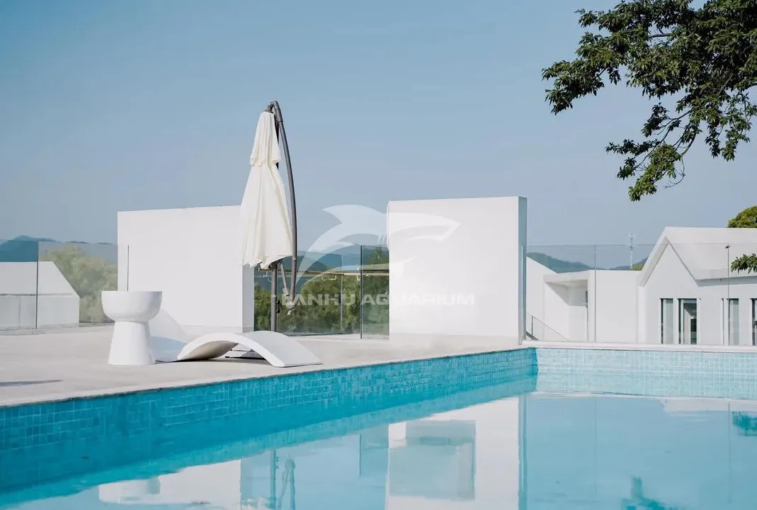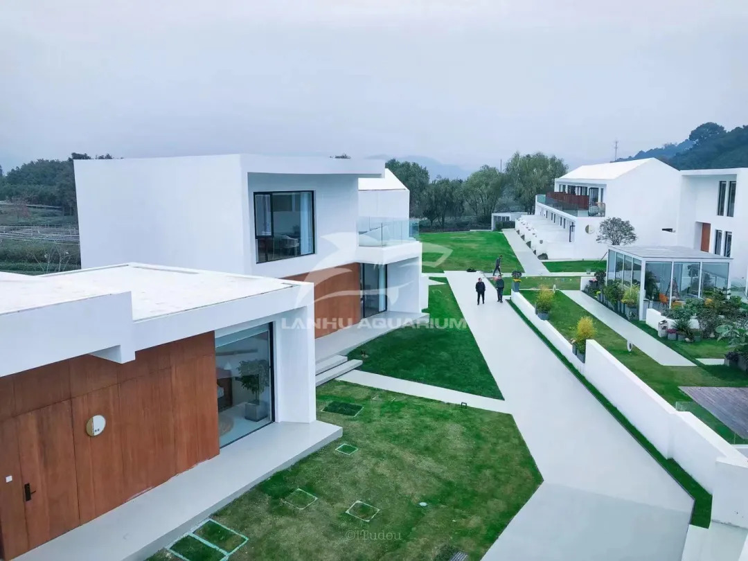 位于龍塢連綿起伏的茶山中的陌領融郡精品度假酒店(以下簡稱陌領融郡),整體項目以純白色為主調(diào),縱伸在綠色的茶香氤氳里,線條利落純粹, 如同一座立于綿延茶山間的現(xiàn)實版“紀念碑谷”,上海藍湖水族工程有限公司從自然環(huán)境中汲取靈感,利用感性又藝術的設計語言, 為陌領融郡白色碑谷間延伸一處藍色港灣,打造懸空泳池,與當?shù)刈匀缓臀幕纬蓪υ?,頗有一番脫離紛擾的自在。 從亞克力的設計與運輸,到工藝的打磨與安裝,再到凈水維生系統(tǒng),每一個環(huán)節(jié),都是百倍的用心所在。最終以超越效果圖的震撼實景,在原始和再造之間尋求一個平衡的契合點, 以其純潔、通透的觀感平衡兩種空間氣質(zhì),秉持與大自然共生的精神,回應場地,和諧共處。